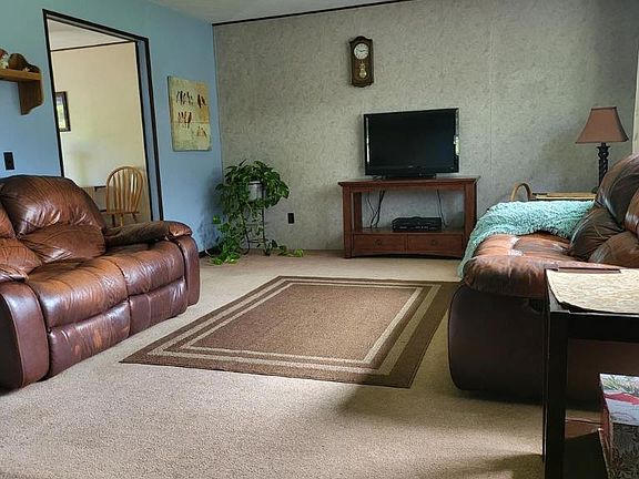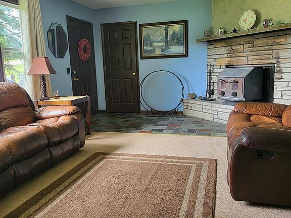 One floor living! 3 bedroom ranch, updated kitchen w/ granite countertops and eat in area. Nice size living room w/ a wood burning fireplace. 2 generous bedrooms w/ one a little smaller. Laundry room off the kitchen on the first floor. Replacement windows throughout. New metal roof. 2 car garage w/ attached shed and 2 additional sheds. Deck off the back. Surrounded by fields so privacy galore!! Partially finished basement but could potentially be a nice size family room if someone wants to finish it off for extra living space. Sellers primarily use wood for heat as it is electric. There is a huge wood pile that will be left for the new owner. The shelf in the LR and the hanging lamp in kitchen do not convey. Spectrum internet at road. Owners use the satellite for internet.