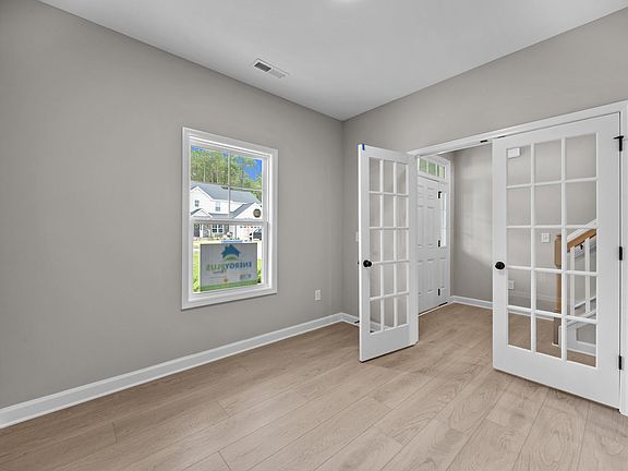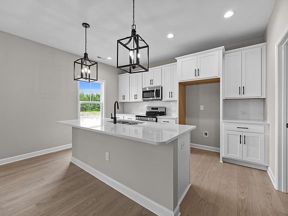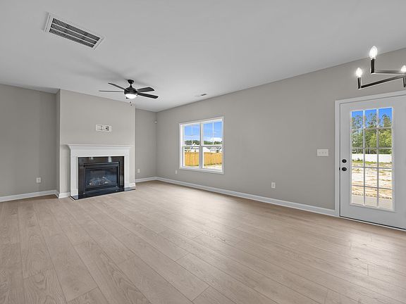 Off the foyer, a versatile flex room with French door entry offers the perfect space for a home office or study, while a conveniently located half-bath adds extra functionality.The open-concept main living area seamlessly connects the kitchen, dining area, and great room, fostering a natural flow for entertaining and everyday living.Designed for both style and efficiency, the kitchen features an eat-in island with bar seating and a sink overlooking the great room and dining area, complemented by white shaker cabinets, "New Willow White" quartz countertops, an "Arctic White" herringbone subway tile backsplash, a spacious corner pantry for ample storage, and a suite of stainless steel appliances, including a microwave, dishwasher, and smooth-top range.The dining area offers direct access to the spacious rear covered porch, while the great room is filled with natural light and highlighted by a gas log fireplace with a decorative mantel and "Absolute Black" granite surround.Convenient access to the garage from the great room enhances the home's practicality.A staircase with painted wood balusters leads to the second floor, where a loft provides additional living space.The second-floor laundry room, located just off the loft, includes a linen closet for extra storage, washer/dryer connections, and durable luxury vinyl plank (LVP) flooring.The primary suite serves as a private retreat, featuring a tray ceiling with crown molding, an en-suite bathroom with a dual-sink vanity with a Home Amenities include: BreakfastArea, CoveredPatio, Fireplaces, GreenConstruction, Playroom, WalkInClosets.