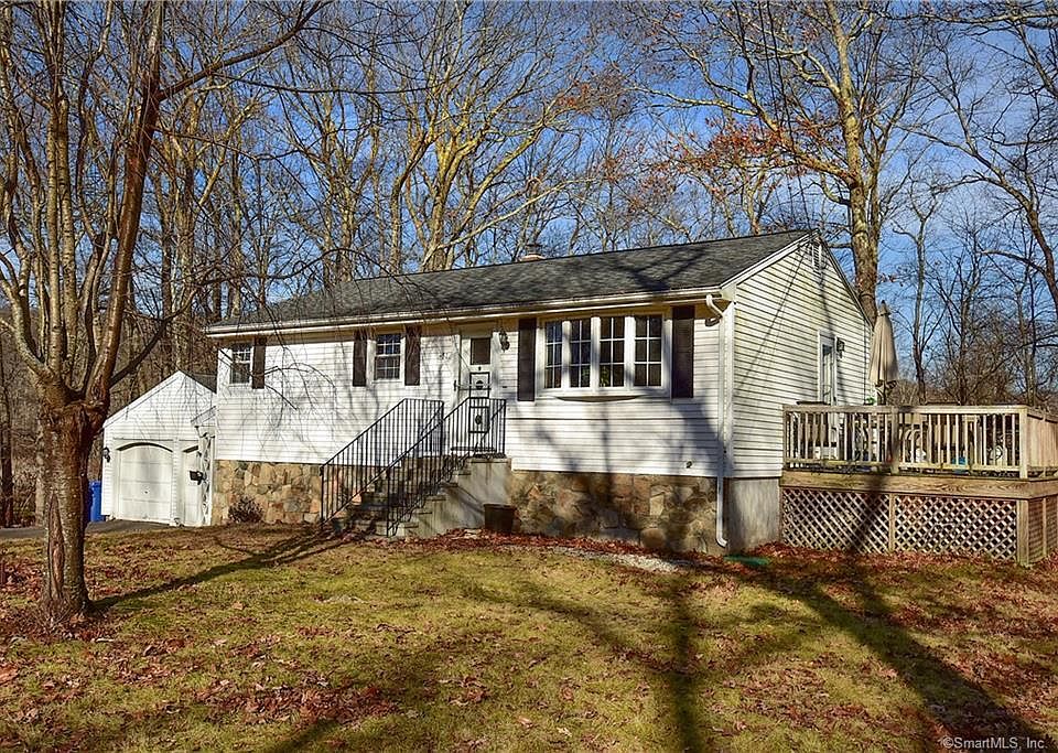 Cozy 3 bedroom vinyl sided ranch home with 2 car garage set on a private 3/4 acre lot in convenient location! Features living room with hardwood floor and bay window, kitchen with laminate floor, 3 bedrooms with hardwood floors and ceiling fans. Updated full bath. Large walk-out lower level family room with beautiful fieldstone fireplace. Thermopane windows. 100 amp. electrical service wired for generator. 12x12 deck, and fire pit. Great home for entertaining family and friends! Convenient to I-84, Rt-44, and UConn!
