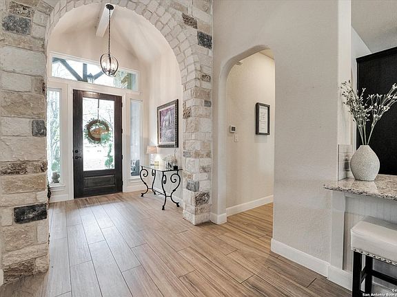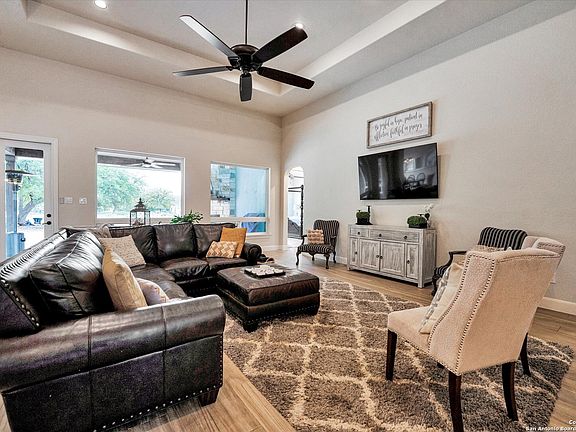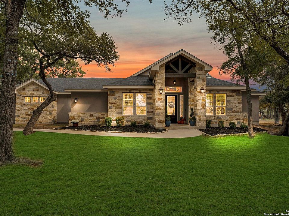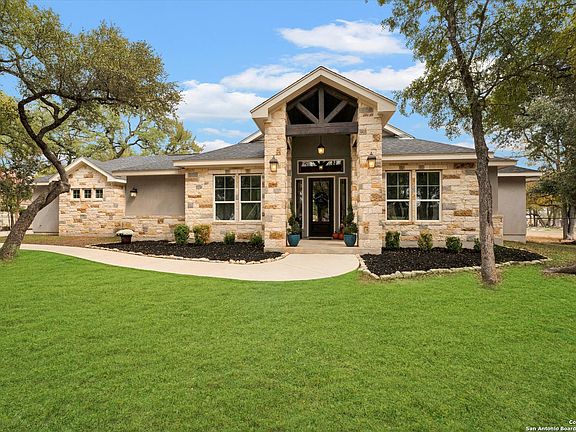 Escape to the idyllic countryside in this enchanting contemporary country setting home that perfectly marries rustic charm with modern comfort. Nestled on a little over one acre of land with incredible mature oak trees, in the heart of the hill country, this property offers a serene retreat from the hustle and bustle of city life. Step inside this bright and inviting house to discover a custom rock arch way entrance, into the large open floor plan of the family living room that pours into the open concept kitchen, perfect for entertaining. The custom dark cabinetry, against the light color hardwood tile flooring, give compliment to the big open windows you experience throughout the house. The kitchen is a chefs & entertainers dream, boasting custom cabinets with warm colored granite countertops, double ovens, stainless steel appliances, to include a gas stove top, large dining area for round or rectangular table of 8+, abundant counter space as there's a bonus island in the middle of the kitchen made especially for serving guests. The bar that overlooks the living/TV area is large enough for over 8-10 bar stools - perfect for any size family. The Outdoor Oasis offers a covered oversized back porch. Enjoy the free roaming hill country & axis deer or taking in the natural beauty of the countryside while having your morning coffee. Either way you're sure to feel the sprawling of the flat 1 acre lot and everything it has to offer. This yard provides plenty of room for gardening, outdoor entertaining, BBQ grilling, and of course that cozy outdoor fireplace that welcomes you with open arms. This home offers a flexible 4 bedrooms or 3 bedrooms with an office/game room. All rooms are plenty spacious and inviting, offering a peaceful night's sleep. Enjoy breathtaking views from anywhere in the neighborhood during a morning or afternoon stroll. The 10+ acre community park offers an abundant selection of outdoor views and experiences that are sure to please any family and friends you invite over. Additional Features: All 1 story 4 side masonry made of stone, rock and stucco Split master from spare bedrooms Large custom closets with extra hanging racks from top to bottom Oversized Pantry Spacious laundry room Ceiling fans Tile in main living Carpet in bedrooms only City Water & Power Aerobic septic system Separate shower & tub in the master bath 2 fairly new electric water heaters Water softener Double pane windows Oversized 2 car garage with side entrance No city taxes Next door to the Guadalupe River, Canyon lake, New Braunfels, Boerne, and only a quick drive to the historic Alamo RiverWalk in downtown San Antonio.