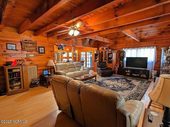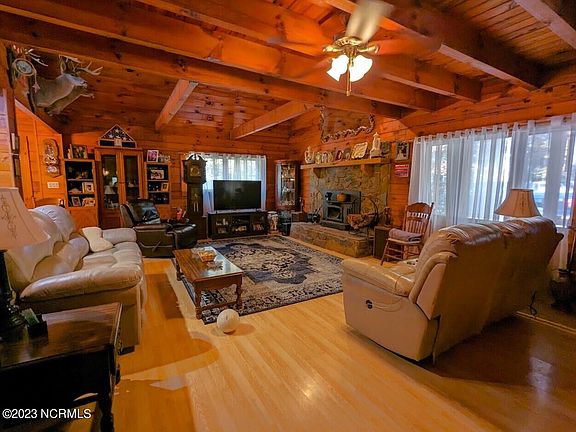 Absolutely stunning Log Cabin in the heart of Lake Jordan. A mere one and a half mile drive to the Jordan Lake Beaver Creek Fishing Pier, this hand built, three bedroom masterpiece features a large living room with a fireplace that easily heats the entire house. The roomy kitchen features custom built cabinetry and a well-lit breakfast/dining area with views of the backyard. Although the house is a true three bedroom, two bath layout, the upstairs loft has the potential for one more bedroom and was designed to be converted with ease. The house sits on almost 3.5 acres and the backyard features a large, covered deck with a massive above ground pool. The property also features a large workshop, a greenhouse, and a deer stand sits on the edge of the property where deer frequent the backyard. It's a great opportunity to own an incredibly well built custom log cabin only 30 minutes to downtown Raleigh and only minutes to the new Vinfast plant and corporate park.