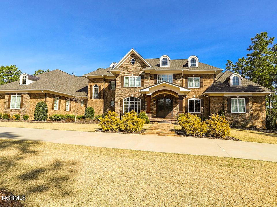 Truly one of the most gorgeous homes in Moore County, this beautifully built custom home with over 6,800 square feet is located on two acres on the 13th hole of the Forest Creek Golf Club North Course. This impeccably maintained home offers exquisite architectural features and unsurpassed attention to detail! Spacious rooms, beautiful coffered ceilings, deep crown molding, gleaming hardwood floors, arched entry ways, elegant spiral staircase in the foyer - every fine detail you would expect in a home of this caliber! A formal dining room has a coffered ceiling with octagonal center, chair rail molding, wainscoting. A spacious living room has a 12-foot coffered ceiling, gas log fireplace with custom white wood cabinetry and bookcases on each side. A spectacular gourmet kitchen has custom white wood cabinetry, granite countertops, custom cherry wood center island, mahogany vent hood, Wolf gas stove and double ovens. An incredible Butler's pantry has a bar with granite countertop. custom wood cabinetry, large wine cooler and ice maker. An amazing recreation room has a gas log fireplace with custom wood cabinetry and bookcases, and French doors that open to the outdoor living areas. A master en-suite on the main level has spacious bedroom with a tray ceiling with crown molding, his and hers walk-in closets with lots of white wood built-ins, large master bath that has a luxurious double walk-in shower, garden tub and a built in refrigerator. Five bedroom suites, two on the main level and three on the upper level with full baths and walk-in closets. The upper level includes two unfinished bonus rooms above the garages with access from one of the two garage. Both garages - one with two bays and one with three - are heated and cooled. It also has amazing covered outdoor living spaces in back that include an incredible grilling and eating area with built-in gas grill, center brick island with seating to one side and a large porch on the other side with masonry fireplace.