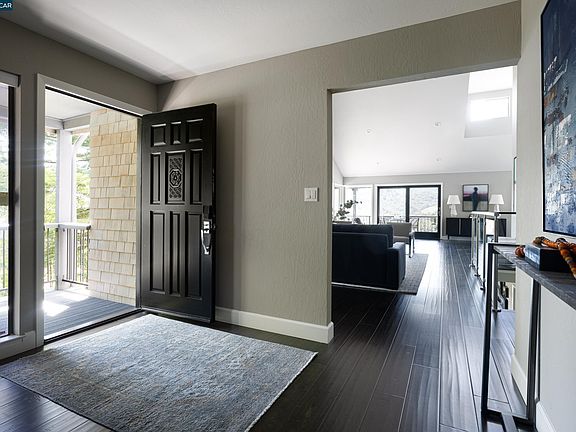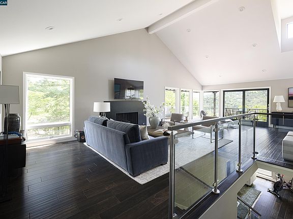 Stunning, Orindawoods home with one of the best locations in the development. Cul-de-sac location, panoramic views, fully remodeled with high-end appointments throughout; hardwood floors, vaulted ceiling, custom and recessed lighting, stair case with glass side panels, Chef's kitchen with island, stainless steel appliances, marble and quartz counter tops, custom cabinets with lots of storage, formal dining area, primary retreat with spa style bathroom, walk in/curbless shower, free standing tub, 2 closets, (one is a walk-in), barn door, private courtyard, master on first level; downstairs features large bonus/family/media room plus 2 additional bedrooms and a full bathroom, laundry room, storage room; two car garage with built-in storage cabinets; adjacent to property is a small community lawn and patio area ideal for recreating and/or children play; minutes to downtown Orinda, BART, and freeway.