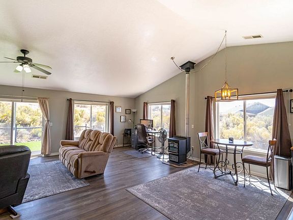 - Flooring- Laminate, Flooring- Wood, Flooring- Tile, Window Coverings, Vaulted Ceilings, Pellet Stove, Ceiling Fan(s), Blinds