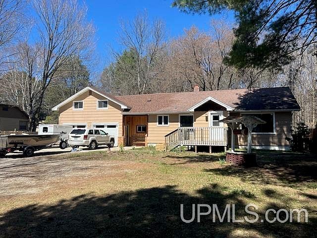 What a FIND in the country minutes away from Escanaba and the Hospital. Nice home with bonus room above the garage. 2 nice sized bedrooms on main floor and have large closets. Ranch style home with full basement and 2 car attached insulated garage. The yard and land is AWESOME with rolling ridge in the backyard. Beyond the ridge is a large blackberry area with hoses hooked up from the house for a watering system and also garden areas. Beyond that is a nice little cottage like structure with a Sauna which also could be a playhouse or sleepover bunkhouse. UNIQUE property and very nice home just waiting for you. 6+acres is absolutely awesome! Seller has a chicken coop and chickens are "negotiable". Also you have a fenced yard for your dogs or ?? Wildlife everywhere including deer and turkeys. Even a few fruit trees to top it all off! Call today for your showing as this home will not last long on the market.