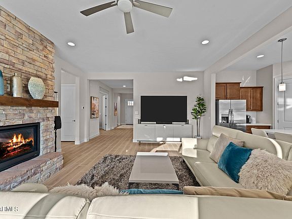 Step into a home where luxury meets functionality, offering a blend of style and thoughtful design. This stunning 2-bedroom, 2-bathroom residence boasting premium upgrades, ensuring every detail exudes sophistication. An open-concept layout, highlighted by wood-look tile and abundant natural light, creates an inviting atmosphere. The living area centers around a striking stone fireplace, seamlessly connecting to a wall of sliding glass doors that open to a beautifully designed backyard. Outside, you'll find a covered patio perfect for lounging or entertaining, surrounded by low-maintenance landscaping that complements the serene desert environment. Golf Cart included with home.