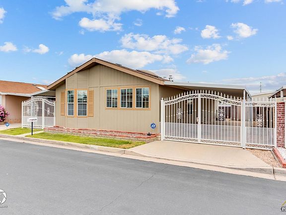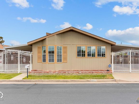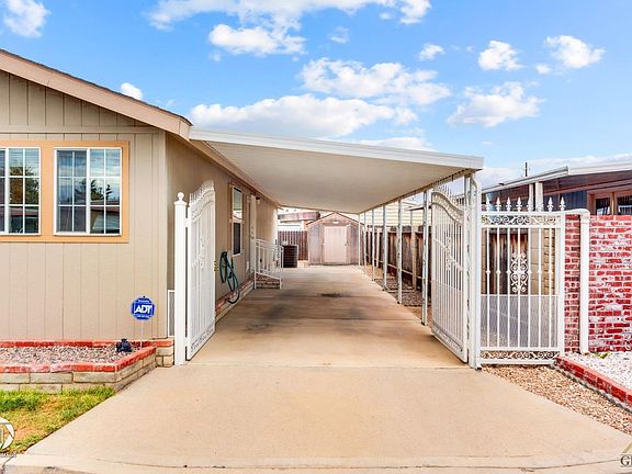 Beautifully maintained 3-bedroom, 2-bathroom home in the highly desirable Royal Palms Mobile Estate Adult Community (55+). The luxury vinyl plank flooring and carpet and skylights throughout provide a stylish and comfortable feel. The entryway features a stunning wrought iron gate, setting the tone for the rest of the home. The great rooms provides an abundance of natural light, and a breakfast nook for casual dining. The kitchen features a newer Bosch dishwasher, white appliances, and an eat-in bar-top for additional seating. The primary bedroom is spacious and features an ensuite bathroom with dual sinks and a walk-in shower. Two additional bedrooms and a bath, as well as an indoor utility room, round out the home's functional layout. The covered yard provides a peaceful and private outdoor space to enjoy, and there is also a shed for additional storage. The community offers amenities such as a pool, clubhouse, and small golf course. Call today to schedule your private showing!