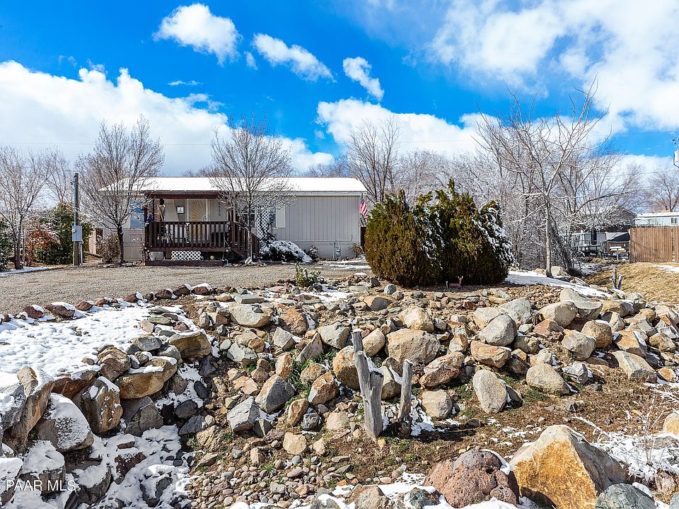 Large lot, distant views and RV parking! This charming 2003 home is located on a .27ac lot and offers a split floor plan, 3 bedrooms, 2 full baths, master walk in closet and a spacious kitchen. The large private corner lot offers, RV parking, distant views of Mingus Mountain from the covered front deck, mature trees, a fully fenced back yard, a spacious 10x13 deck for entertaining, fire pit, large detached 10 x 16 workshop/bunkhouse providing additional storage or potential work from home office. Great starter home or a second home getaway! Located in Prescott Valley near schools, parks, medical facilities, shopping and entertainment.