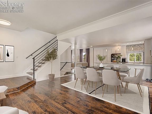 Completely remodeled 2-story home with modern luxury finishes. Offering panoramic views of the mountains, surrounded by comfort & convenience. Located on a cul-de-sac in the desirable Summit at Vista Mesa neighborhood w/easy access to restaurants, shopping, entertainment, Sunset Mesa open space/trails, D-11 schools & main roads. As you enter all new LVP wood floors greet you and flow throughout the entire home. The great room draws you in boasting 9’ ceilings, & wall of windows letting the natural light pour in illuminating the open space. The dining space has bump out bay window and can accommodate a large table for those formal occasions. The nearby all new gourmet kitchen opens to the great room creating the perfect layout to entertain friends & family. Featuring, shaker style cabinets w/modern brass hardware, built-in pantry, expansive quartz peninsula w/breakfast bar, pendant lighting, custom chevron mosaic tile backsplash, apron sink, gas range w/pot filler & sleek black stainless-steel appliances including double wall mounted ovens. From here step out to the incredible fenced backyard, w/ great views of Pikes Peak from the newer composite deck w/ metal railing. Completing the main level is the office w/ large windows capturing mountain views, updated ½ bath & laundry room. Head upstairs to the primary bedroom boasting sitting area, vaulted ceilings, walk-in closet & updated private 5pc bath w/ double vanity, granite counters, custom mirrors, LED lighting & soaker tub. 3 additional upper bedrooms have easy access to hall full bath w/ double vanity, granite countertop & new lighting. 2 of the bedrooms boast panoramic views of the mountains & craftsman built wood wall features. Downstairs the walk-out basement presents an open family room w/ LVP wood flooring & new wet bar. Lower lvl bedroom has easy access to updated full bath. Bonus: Central A/C, new ext/int paint, smart thermostat & more. See it today!