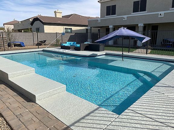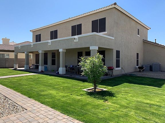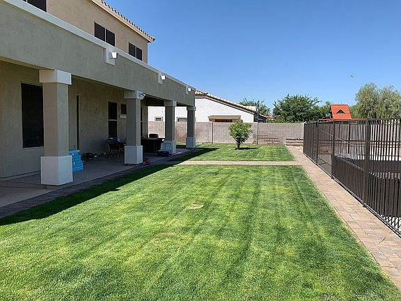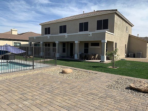 Laveen’s Best Kept Secret! Vaquero Estates, Gated community next to Carver Mountain. Spacious home with many upgrades; porcelain tile downstairs; wood laminate upstairs; painted inside and out; large open kitchen with custom paint; stainless steel appliances; gas cooktop; Jack n Jill bathroom updated with custom cabinets and granite countertops; beautiful large lap pool with water feature, baja, and in floor self cleaning system, built in 2020; backyard is very private surrounded by single story homes; covered patio; new landscaping front and back; sunscreens on all windows; 3 Car Garage; 4 additional parking spaces in driveway; RV Gate; Park with playground across the street; two other large grass park areas; Mountain views and walking distance to hiking trails and the Laveen Elementary School. Tours available by appointment.