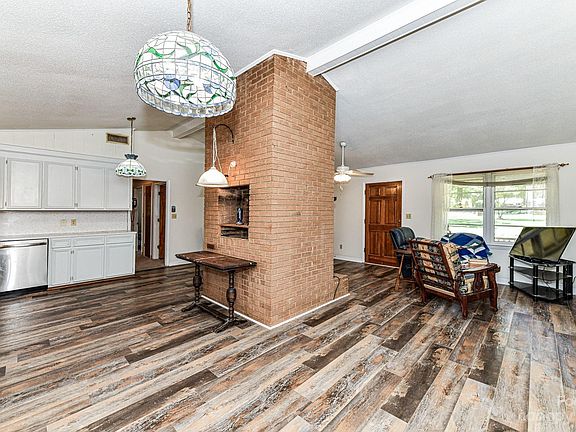 Lovely brick ranch home with a front porch sits on 2 acres with a beautiful country setting. Home is freshly painted and features an open floor plan with the living room, dining and kitchen all as one with a brick fireplace in the middle and new laminate wood floors. The kitchen has good counter space and ample storage. Both bedrooms are good sizes and have carpet flooring. Retro bathroom with original fixtures. Separate laundry room has cabinets for extra storage. The large bonus room off the kitchen has access to the rear yard. Building in the back has 3 bays to it and one was previously used as a workshop. Come take a look and make this the dream home you have been waiting for.