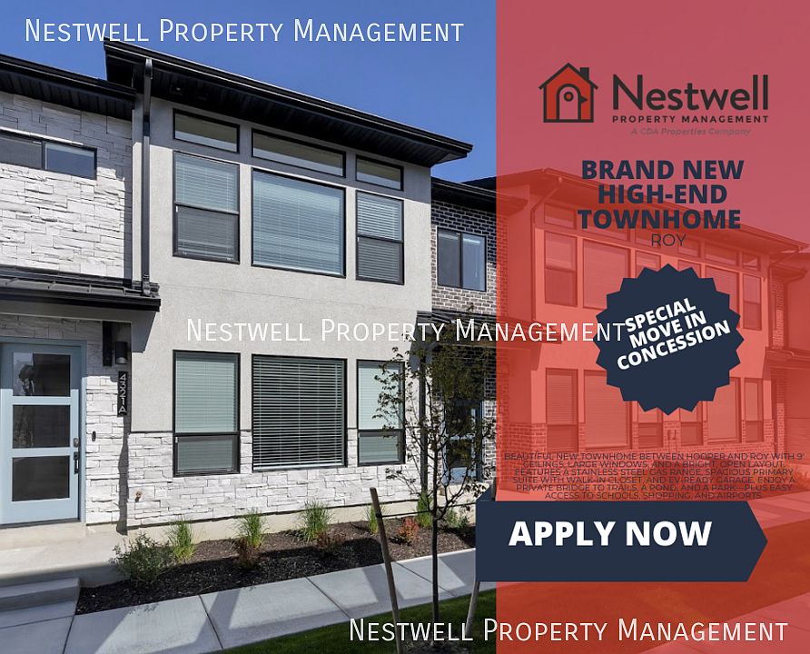 *$500 gift card with every new lease signed by September 15, 2025 *Promotion: If you sign a lease for a Nestwell Managed rental in the month of September, your application fees will be refunded. Fully finished, newly built townhome on the edge of Hooper and Roy. With 9-foot ceilings on both floors and large windows throughout, this home is full of natural light and open space. The kitchen features a stainless steel gas range and a layout that makes cooking and gathering easy and enjoyable. Primary suite upstairs offers plenty of room to unwind, with a spacious walk-in closet and a double vanity in the bathroom. Within the new West Field High School boundaries. One of the best parts, A private bridge just steps from your door leads to a peaceful walking trail and park perfect for relaxing or enjoying the outdoors. Ogden-Hinckley Regional Airport is just minutes away, and Salt Lake International is only 40 minutes from home. Comfort, convenience, and connection to nature all in one place. Schedule your Showing Appt. ONLINE NOW! AVAILABLE DATE: NOW! LEASE LENGTH: Lease ending longer term of Spring of 2027 OCCUPANCY RULE: No More than 3 unrelated adult occupants TYPE: Townhouse SQUARE FEET: 1619/1619 GARAGE: 2 car garage FEATURES: - 3 Bedrooms - 2.5 Bathrooms - Stainless Steel Appliances - Island Kitchen - Cable Ready - Ceiling Fans - Double Vanity - Family room - Upgraded Cabinets - Vaulted Ceilings - Walk-In Closet - Nest thermostat - Ring doorbell - Washer and Dryer are negotiable - And more... TENANT CHARGES: - Resident to sign/pay for gas & electricity - Resident to pay water, sewer, and garbage monthly - Resident to pay $75.00 HOA Fee per month - Resident Benefits Package (RBP) = $34.95 per month *For information on this service - Property Damage Liability Waiver For Residents (PDLW) = $15.95 per month. ** For - Security Deposit = Same as rent, depending on application score (fully refundable) - Application Fee = $40.00 per applicant 18 and older - Lease Initiation Fee = $150.00 after approval and upon signing - Pet fees as listed (if applicable) - If the mailbox is a community box that requires a key, it is owned by the Postal Service. A small fee may be required to get mailbox keys upon move-in. *Washer & Dryer provided as a courtesy, owner may choose not to repair them HOA INCLUDES: - Small park, - Yard care and Snow removal YARD CARE: HOA handles yard care and snow removal PETS: - $419.00 per pet security deposit ($209.50 AMOUNT refundable) & $55.00 pet rent per pet. - You will be required to fill out an animal profile and will be provided the link after you have submitted your application and paid the fee. - No resident or residents at any one premises shall at any one time own, harbor, or license more than ONE total animal in any combination - ONE PET will be considered if they meet our pet guidelines.- The pet application fee is $20 for the first pet, $15 for each additional pet, and $0 for assistance animal accommodation requests. - For puppies & kittens less than 12 months old, there is a non-refundable fee of $100 and a monthly charge of $10/month until the pet reaches 12 months of age in addition to the regular fees. NO Smoking or Vaping is permitted in or on the property. SHOWING INSTRUCTIONS: TO APPLY: - $40.00 application fee per adult to be paid at the time of application. - All applicants will be required to fill out an animal profile even if you do not have a pet. The link will be provided after you have submitted your application and paid the fee. - We process all applications, and the first application that completes all the paperwork requirements will be processed first. PROPERTY MANAGER: CDA/Nestwell Property Mgmt. 8813 S Redwood Road #D1 West Jordan, UT 84088 * All information is deemed reliable but not guaranteed and is subject to change. Animals (Friendly) Cooling (Central Air) Countertops (Granite/Quartz) Disposal Double Oven Double Vanity Floors (Carpet) Floors (Laminate/Lvp) Garage (2.5 Car) Hoa Community I 15 Access New Paint New Property ( 5 Years) Separate Tub & Shower Smoking (Not Allowed) Sprinklers (Auto) Upgraded Cabinets Washer/Dryer Hookups TENANT CHARGES: - Resident to sign/pay for gas & electricity - Resident to pay water, sewer, and garbage monthly - Resident to pay $75.00 HOA Fee per month - Resident Benefits Package (RBP) = $34.95 per month *For information on this service - Property Damage Liability Waiver For Residents (PDLW) = $15.95 per month. ** For - Security Deposit = Same as rent, depending on application score (fully refundable) - Application Fee = $40.00 per applicant 18 and older - Lease Initiation Fee = $150.00 after approval and upon signing - Pet fees as listed (if applicable) - If the mailbox is a community box that requires a key, it is owned by the Postal Service. A small fee may be required to get mailbox keys upon move-in. *Washer & Dryer provided as a courtesy, owner may choose not to repair them HOA INCLUDES: - Small park, - Yard care and Snow removal YARD CARE: HOA handles yard care and snow removal PETS: - $419.00 per pet security deposit ($209.50 AMOUNT refundable) & $55.00 pet rent per pet. - You will be required to fill out an animal profile and will be provided the link after you have submitted your application and paid the fee. - No resident or residents at any one premises shall at any one time own, harbor, or license more than ONE total animal in any combination - ONE PET will be considered if they meet our pet guidelines.- The pet application fee is $20 for the first pet and $0 for assistance animal accommodation requests. - For puppies & kittens less than 12 months old, there is a non-refundable fee of $100 and a monthly charge of $10/month until the pet reaches 12 months of age in addition to the regular fees. NO Smoking or Vaping is permitted in or on the property.