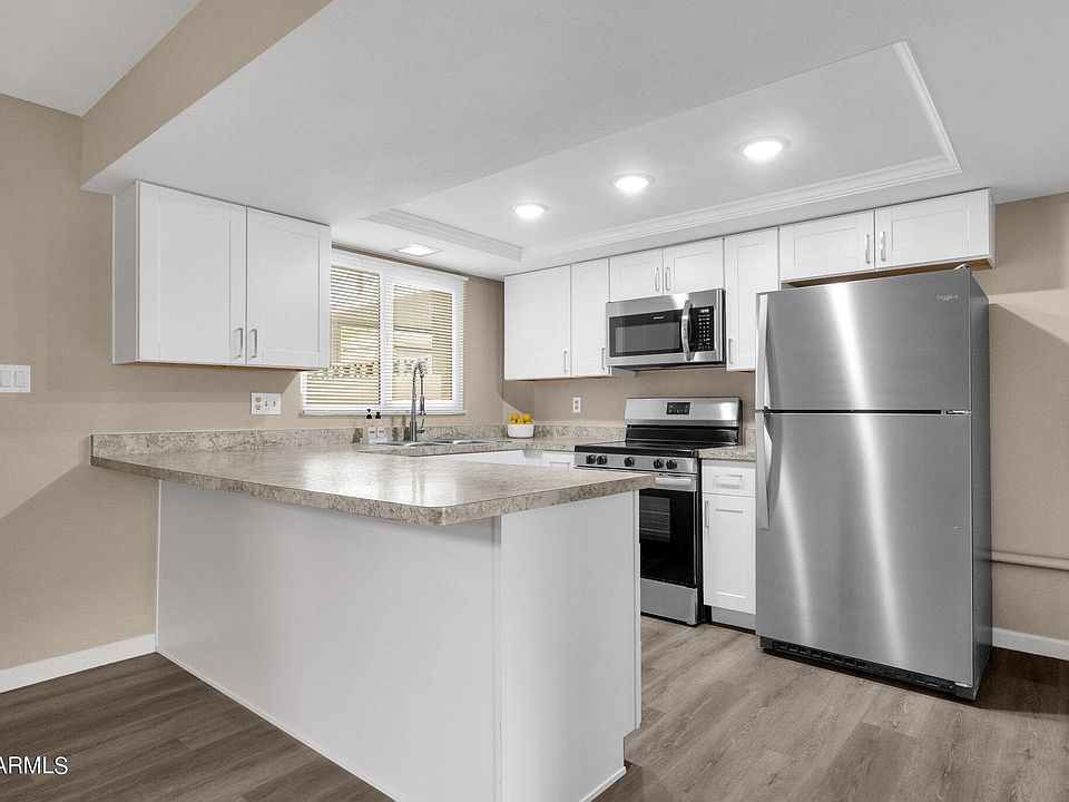 Incredible 4 bedroom, 2 Bath, Renovated Value! Like moving into a brand-new home; down to the hinges & door knobs. All new vinyl plank flooring throughout plus fresh baseboards! All new Window Coverings, Vanities, and Toilets. Brand new, modern Kitchen including ALL New Appliances, Sink, Countertops & Fixtures! Fresh Paint. Inside Laundry. Breezy Security Doors both Front and Back! Convenient Direct Entry from TWO Covered Parking spaces. Kitchen Window overlooks Shady Patio that is Large, Private, and Secure w/ Block Fencing. Front Picture Window frames the Grassy GATED common area including POOL and Playground! FOUR bedrooms = room for Everyone and a home office. Storage Shed with Electrical. Renovated extra storage space in kitchen. Conveniently Located between GCU and ASU West.