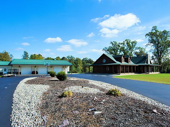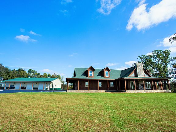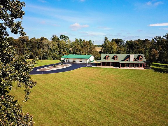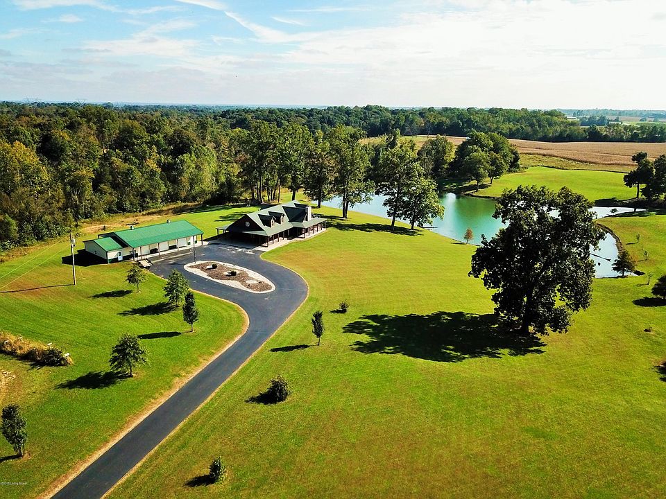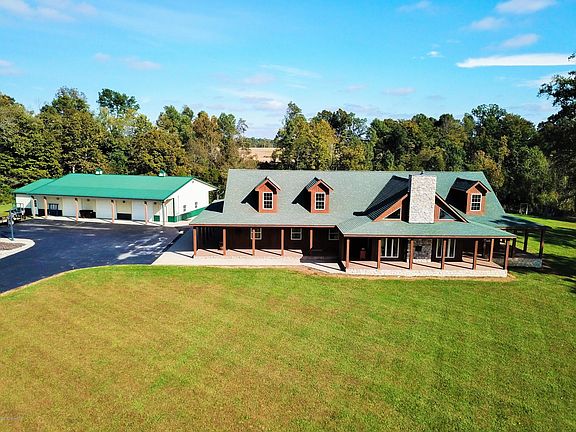This spectacular lodge style, cedar sided home is situated on 38.86 beautiful, rolling Trimble County acres. This magnificent home features over 2000 sqft of covered, wrap around porches . From the porches you can enjoy views of the rolling acreage, woods and the approx. 5 acre spring fed, stocked lake. The lake is approx 47' deep at it's center and was designed to raise trophy fish. No expense was spared on the construction of this lake. The expansive lodge style room toward the center of the home is open and encompasses the kitchen, dining area and great room. This area, which is made for entertaining, features Brazilian Walnut hardwood flooring, ceilings that soar to 20 ft, an abundance of natural light & a wood burning stove perched atop a stone hearth with stone accent wall behind. There is also an open loft overlooking this area featuring a beautiful sculpted iron railing with nature scenes. The kitchen features lots of beautiful hickory cabinets, a counter bar, S.S. appliances and a walk-in pantry. This home features a split bedroom floor plan with all of the bedrooms being quite large. The master bedroom is located just off the Great Room, it offers a view of the lake and features a beautiful en suite master bath. The other 3 spacious bedrooms and impressive full bath are situated on the other side of the Great Room. Last but not least this property offers a 3 bay 34' X 76' pole building with concrete floors, electric, water and a 16' X 34' partially finished man/woman cave or efficiency apartment. There is a 12' X 76' shed to the rear of the building for covered parking of additional equipment. Whatever you prefer; gardening, hunting, fishing, four wheeling & more....... this property delivers!! Call today for your private showing.