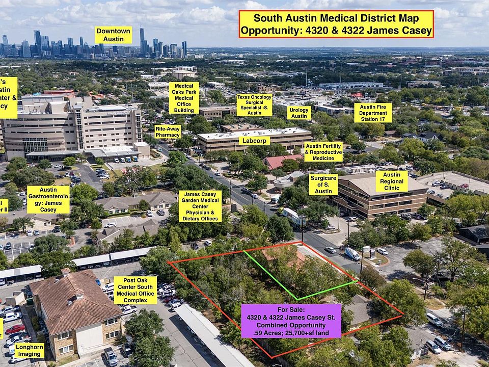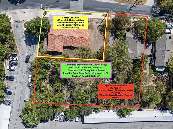 Premier Development Opportunity on .42 acre lot on the same block as ST DAVID'S SOUTH AUSTIN MEDICAL CENTER. The property is currently zoned Single Family - 3 - Neighborhood Planning (SF-3-NP). This property is located within the St. David's Hospital "Special District" making is prime for commercial redevelopment. See the South Austin Combined Neighborhood Planning Area Map and notice that this property is in Blue in Special District along James Casey Street. The actual home structure is either full remodel or teardown. See the Austin Zoning map that all surrounding properties have already been converted to commercial properties and have LO (Limited Office), GO (General Office) or LR (Neighborhood Commercial) zoning in this Neighborhood Planning district, and this is one of the final lots to be updated. Notice the large size of the lot with approximately 67' of frontage on James Casey, 131' deep and the back part of the lot wraps around the corner property with 178' rear property line. Endless possibilities in this great area.