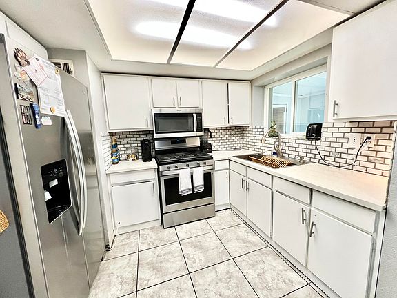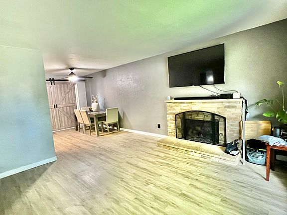 Beautifully landscaped, 3 bedroom, 2 bath home on the West side! Step inside and be greeted by custom paint, upgraded wood laminate flooring, a large wood burning fireplace, dining area with ceiling fan, kitchen with custom tile floors and custom tile backsplash and stainless steel appliances including a built in microwave. Beautiful barn doors lead to a fully enclosed patio room. Outside there is another covered patio with stamped concrete. The large backyard features a built in gas firepit along with a dog kennel. Both bathrooms have upgraded custom tile in the bathtub / shower. The master bedroom has it's own master bathroom and there are washer and dryer hook-ups in the hall closet. There is also a 2 car attached garage and the HVAC was replaced approximately 2 years ago. Come see this wonderful home today!
