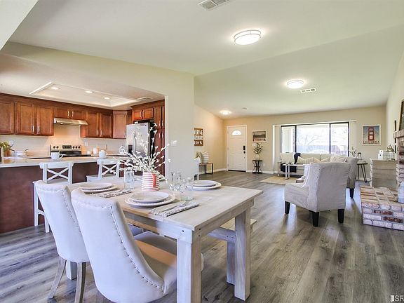 This sophisticated 4 bedroom, 2 bath home has been completely renovated with meticulous attention to detail and style. Everything is brand new, from the wood laminate floors to the quartz countertops, cabinets, vanities, fixtures and fine finishes in the remodeled kitchen and serene baths. A large spacious living room, where a warm brick fireplace creates a classic focal point for the generous seating area. The living room flows into an airy, expansive dining room illuminated by sleek track lighting, a large window, and sliding glass doors opening directly onto the backyard, creating a seamless indoor/outdoor flow ideal for entertaining. The professionally appointed gourmet kitchen is roomy and welcoming, with stainless steel appliances, ample storage and a breakfast bar perfect for informal meals. Down the hall, there is a laundry room with hookups and storage, and an elegant, pristine full bath serving 3 sizeable, light-filled bedrooms. Double doors reveal the 4th bedroom.