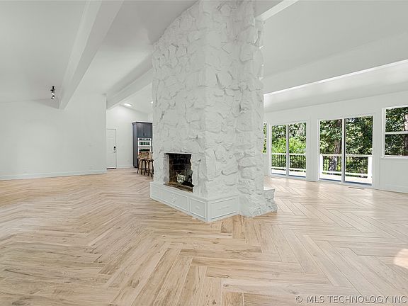 Enjoy the seclusion of this desired neighborhood within minutes from the heart of south Tulsa and less than one mile from Saint Francis. Inside, the open floorplan with a living, dining, and kitchen combo creates a spacious and inviting atmosphere, complete with vaulted ceilings and plenty of natural light with the wall of windows. The kitchen boasts a luxurious waterfall quartz island with seating for six with a flexible room design with 2 living areas joined by see-through gas stone fireplace. Enjoy the evenings on the sprawling deck that is the length of the house as you enjoy your peaceful 1.34 acre (mol) retreat with mature trees that gives you the serenity you need after a long day of work. The home has a new roof, windows, appliances, paint inside and out, flooring throughout, complete bathroom and kitchen remodels and more. This is a must see! Schedule your private showing today!