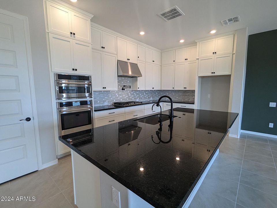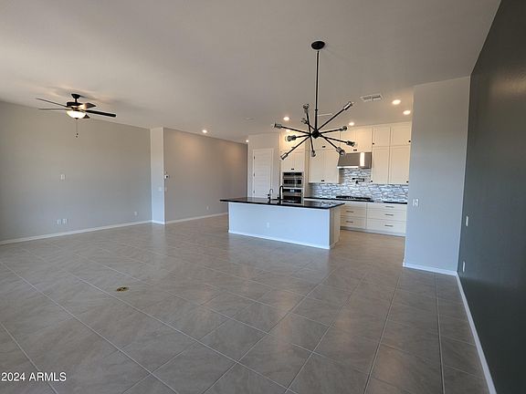 Complete and move in ready; NEW single level w/3 beds, 2.5 baths, study and flexible retreat area w/3 car side by side garage; gorgeous model kitchen with modern, white stacked cabinets to the ceiling, pull out drawers at the bottom, stainless GE appliances w/6 burner gas cooktop, pot filler & custom tile backasplash; kitchen opens to family room with views of HUGE 68' BACKYARD with no neighbors behind you & extended covered patio; large secondary rooms; owner's retreat w/huge bath showcasing dual sinks, walk in tiled super shower w/second showerhead (raincan); upgraded pad/carpet, tile and wall paint throughout; Blinds installed; water soften; extensive new home warranty & 2x6 construction.
