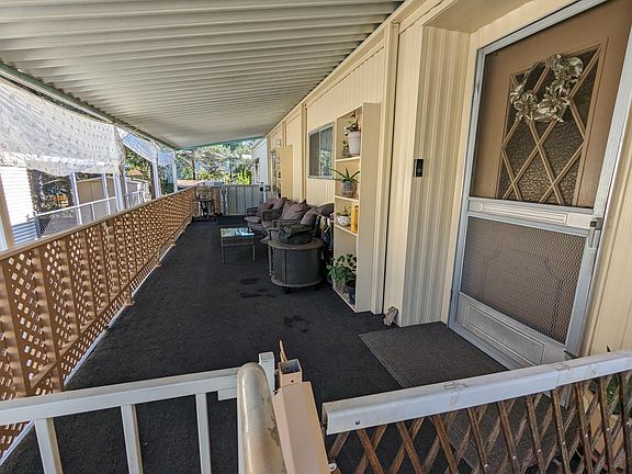 Sold AS-IS! Spacious, well kept home, on the last street, in an all ages park. Quiet location. Newly maintained central AC/Heat. Wheelchair lift on front porch. Landscaped yard; Raised garden bed; Covered work area. Side street access, not through the park. All ceilings have been freshly painted. Master bedroom has a built-in dresser, en-suite bathroom with soaking tub and separate standing shower. Second bedroom has built-in storage. The en-suite bathroom has a combination tub/shower, a fresh coat of paint, and can be accessed from both the bedroom and the laundry/mudroom.Laundry/mudroom, with W/D, fresh paint and has a built-in desk w/ drawers. Kitchen has a disposal, refrigerator, dishwasher, gas range, gas oven and plenty of storage. Slider door leads to a 8x30 covered porch