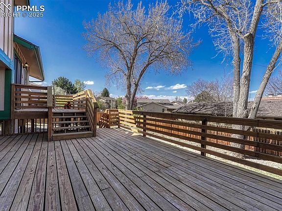 Located in the top-rated Cheyenne Mountain School District 12, this updated Country Broadmoor home offers comfort, style, and convenience. Upgrades include: Class 4 impact-resistant roof, Radon mitigation system, Extended concrete driveway with extra parking, many newer vinyl windows, extensive hardwood flooring throughout, fresh paint, new lower level carpet, custom iron handrails, and xeriscape front yard with mature trees, newer water heater and Updated kitchen. The remodeled eat-in kitchen includes hickory cabinets, slab granite counters, stainless Electrolux and Whirlpool appliances (including a 5-burner gas range and hood), and opens to a massive two-tiered reinforced deck—wired for a hot tub—overlooking a large, fenced, pet-friendly backyard. The functional layout includes a spacious living and dining area and four bedrooms and two tastefully renovated bathrooms. The primary suite boasts a walk-in closet and an ensuite with double sinks and luxurious shower. Downstairs, enjoy a large family room with a brick fireplace, a flexible office/4th bedroom with closet and a light filled finished basement with multi-function flex space and additional storage. This home blends thoughtful updates with a flexible floor plan in a highly desirable location that is just minutes from Fort Carson, trails, parks, shopping and dining.