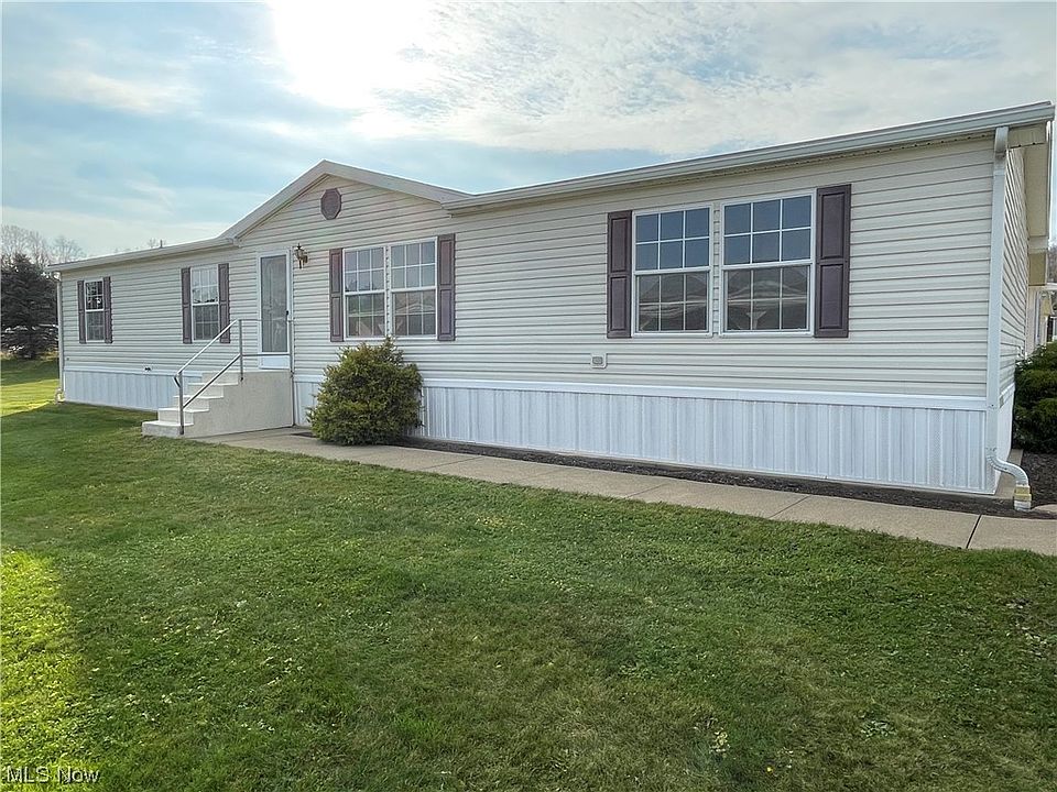 Clean and ready to move into, Nantucket Modular home with large carport, and concrete driveway. Spacious open concept. First-floor laundry. Located in the Woodale Village retirement community just west of Minerva off SR 30. Quiet and clean area and good management. The lot rent is $265 per month. City water and sewer.