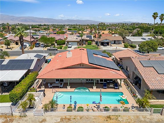Beautifully Remodeled Golf course home in Palm Desert Country Club. As you enter the home you can't help but be mesmerized by the beautiful view through several windows that line the rear of the home. From the sparkling pool and Jacuzzi to the expansive view of the golf course. Amazing open floor plan as the kitchen and dinning and living room all share the same view. Solid wood cabinets ans beautiful granite countertops. Remodeled bathrooms as well as new HVAC, water heater and paid for owned solar system included in the sale. Every area is well appointed and ready for you to move in.