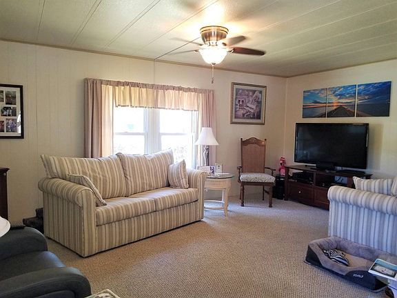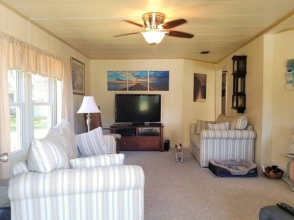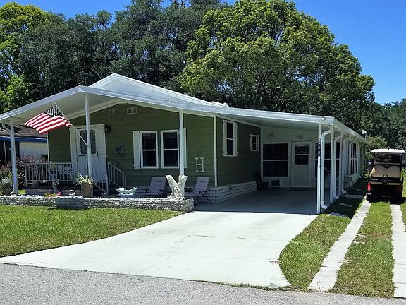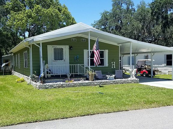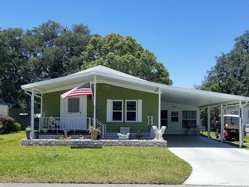 UNBELIEVABLE AMOUNT OF STORAGE SPACE! This gorgeous 2 bed/2 bath double wide has features that are very rare, like a golf cart garage in the back! In addition to the garage, the attached shed is huge and has ductwork/AC for maximum comfort. Starting with great curb appeal, gorgeous covered porch with front door entry, beautiful siding and plenty of parking. From the drive you enter into the attached 12x17 sunroom. This is the ideal hang out with gorgeous double paned windows, plenty of light and has A/C for year round enjoyment. Through the sunroom to the extra large work shop/shed, which measures 12x17 and out the back door to the shady patio and attached golf cart garage with roll up door. Inside the home is beautifully done. Kitchen countertops and both showers were recently resurfaced and look like new! Newer double paned replacement windows throughout the entire home! HVAC unit new in 2014 and new Ductwork. Water heater replaced also. Features 2 spacious bedrooms. The master is oversized with lots of storage! This home is in great condition and move in ready. Located in the age qualified community of Clover Leaf Farms.