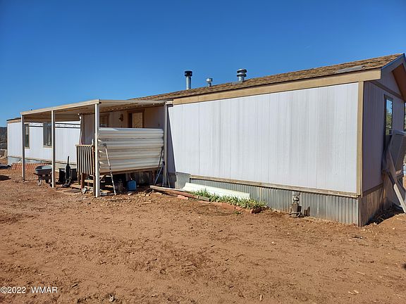 Single wide manufactured home on just under 5 acres of land. Electricity and well are present; leased propane. 3 bedroom 2 bath split bedroom, woodstove in living room, evaporative cooler on front bedroom. Property is set up for chickens and goats currently, woodpile and electric wood splitter to convey. Conex attached to goat pens to convey. Kitchen offers ample storage space and built-in desk, and dining area just off kitchen. Not far from paved roads; easy access. Will need TLC, an opportunity to make the home your own.
