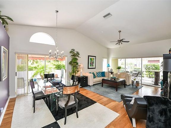 Immaculate Arthur Rutenburg villa in the Peridia Golf & Country Club boasts everything the Florida lifestyle embodies. Meticulously maintained and maintenance-free, this home has bright and open living spaces featuring vaulted ceilings and engineered wood floors with tranquil surroundings from multiple outdoor spaces. Accessible from most every room are open courtyards, as well as a screened lanai accentuating the notorious indoor/outdoor Florida way of life. Even the large eat-in kitchen with center island has sliders to the outdoors making for a perfect grilling location. The split bedroom plan offers privacy, while the additional den can be used as office or 3rd bedroom. The master bedroom enjoys direct access to the screened lanai, high vaulted ceilings, wood floors and generously sized walk-in closet. The master bath has a sunken garden tub, separate shower, and dual sink vanity. Residing in Peridia enhances the active sunny lifestyle experience with an equity golf membership including an array of social activities such as member golf tournaments, Friday night dinner dances, musical events, water aerobics, pickle ball, tennis, bocce and so much more. You'll love the outstanding amenities and friendly atmosphere whether its for year round living, or your next vacation home.