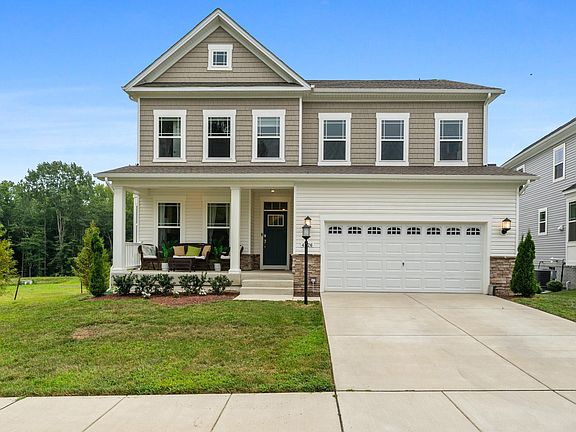 Prepare to fall in love! This meticulously styled, over 4000 sq ft, 5-bedroom, 4.5-bath home—built in 2023 in the sought-after Stonehaven community—blends magazine-worthy design with unmatched functionality, including a complete in-law apartment in the fully finished basement! From the moment you pull up to the premium corner lot, the curb appeal and inviting covered front porch set the tone for what’s inside. Step through the front door to 9ft ceilings, luxury vinyl plank flooring, tasteful wallpaper and elegant crown molding. There’s a spacious office off the foyer with French doors and recessed lighting, plus a stunning formal dining/living area with arched entries, a show-stopping chandelier, and more recessed lighting. The gourmet kitchen overlooks the family room and features stainless steel appliances, a gas stove, quartz counters, a massive island, pantry, backsplash, pendant lighting, and a bright morning room—perfect for casual dining. Upstairs, the primary bedroom boasts tray ceilings, a walk-in closet, and an immaculate bathroom with double sinks, a soaking tub, and an oversized shower with a bench. Bedroom #2 enjoys its own full bath and walk-in closet with custom organizing, while bedrooms #3 and #4 share a jack-and-jill bath. Upper level also includes a convenient upstairs laundry room with a wash sink. The finished basement is made for entertaining with an open rec room and a separate full in-law suite—complete with a kitchenette, granite counters, family room, LVP flooring, full bedroom and bath, plus a bonus room (potential 6th bedroom), unfinished storage, surround sound, and walkout access to the backyard. Other features include a 2-car garage with epoxy flooring and built-in cabinetry and a privacy fence around the back. Enjoy all the bells and whistles in a vibrant community with a pool, fitness center, playgrounds, walking trails, parks and more—just minutes from shops, dining, schools, and everything you need!