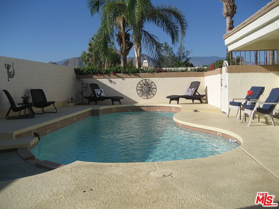 RELAX in this beautiful RESORT GEM This tranquil home comes with a POOL, SPA , BBQ Center, FURNISHED and on the 9th Hole of a Golf Course. Close to the Clubhouse. View practically from every room. 3 Bedrooms, one is currently an office. Upgraded open concept kitchen , beautiful tile floors ,upgraded windows and doors, Cathedral ceiling. Enjoy the mountain views from the pool and spa, or watch the sunset in the backdrop of the golf course. Low maintenance front and backyard with Desert landscape. 2 Car garage with an enclosed golf cart area. This home is move-in ready and offered furnished per inventory list. FREE WI-FI