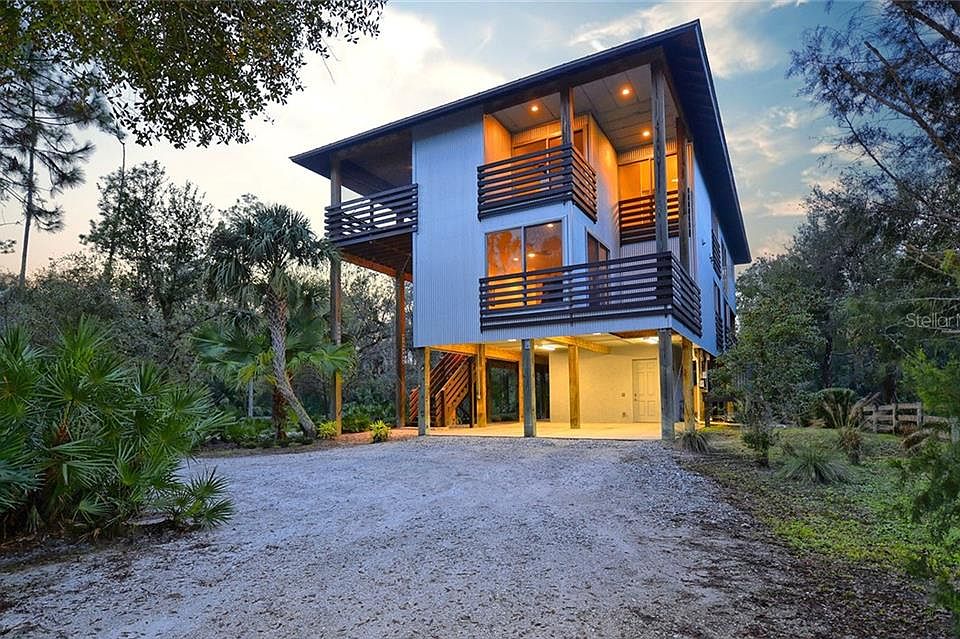 Welcome to a truly one-of-a-kind contemporary home, modern architecture designed by architects Anderson Anderson, custom-built like a fortress amongst 20 acres of pristine untouched pine and oak hammocks of the Peace River, this property offers total privacy and seclusion. Situated in a gated neighborhood, the property invites you to enjoy the surrounding lush natural landscape. Enter the home by elevator, from the first to second level you'll be greeted by soaring ceilings and an open floor plan including the kitchen, dining and living rooms surrounded by windows with views into the canopy. The main level offers a large screened porch running the span of the house on the south side and a den/potential third bedroom on the east side, providing plenty of room to enjoy the spacious layout of the home. Take the elevator or architecturally inspired steel staircase to the third level where the views open up to the sky and top of the canopy. This level features the master bedroom, en-suite guest bedroom, loft space and another screened porch. The property has an easement to access the Peace River, where winding nature trails take you to creeks and branches from the river. This home is set in a nature lover's paradise. Every inch of the house has been meticulously maintained and looks like new from the day it was built in 2009. Don't miss out on this opportunity to own a beautifully designed, expertly constructed, modern home set in one of the most peaceful and tranquil locations of natural Florida wilderness.