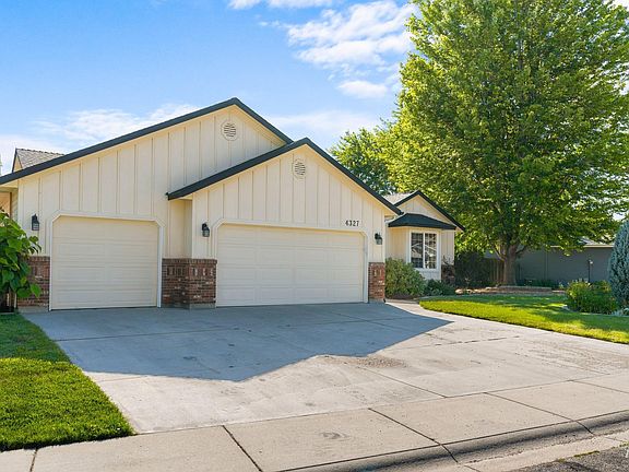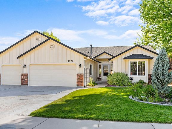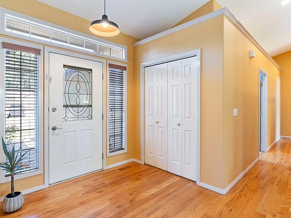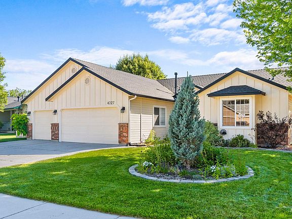 Beautiful well-maintained home comprising 1745 square-feet of single-level living space and a three-car garage. Nestled in a great SE Boise neighborhood, minutes from greenbelt, airport, Micron, Boise State and hospital. Living area centers on spacious great room with vaulted ceiling, beautiful hardwood floors, and gas fireplace joining kitchen, dining, and living room. Four upgraded bedrooms with engineered wood floors. One converted to office with expansive fir and pine shelves. Two full baths with shower, tub, and sinks. Primary with oversize tub and generous walk-in closet. Fenced yard watered by automatic sprinkler and drip system. Blended landscape mixes lawns, pollinator garden, raised beds, established berry patch, fruit trees, and rock xeriscaping. Large covered deck and patio provide shady outdoor entertaining area. Three garage bays are surrounded by work bench, shelves and cabinets. Major upgrades within the last five years include 50-year roof, gas water heater, gas furnace, and central air