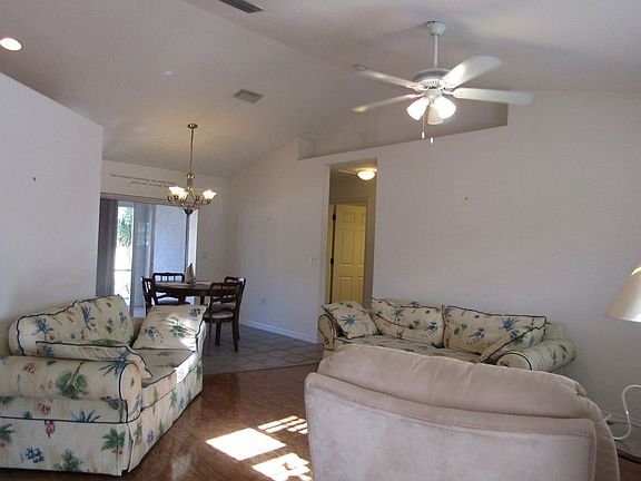 Pet Friendly single family home with yard and large vacant lot next door! Lawn care included. 3 bed. 2 bath. Tile and Laminate floors throughout. Large 2 car garage. Extra concrete slab off driveway for boat or RV parking. Screened in lanai. Paver grilling pad. Storage shed. Washer/Dryer included. Well and Septic. Garbage/Recycling pickup included.