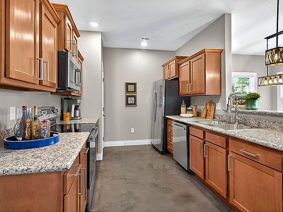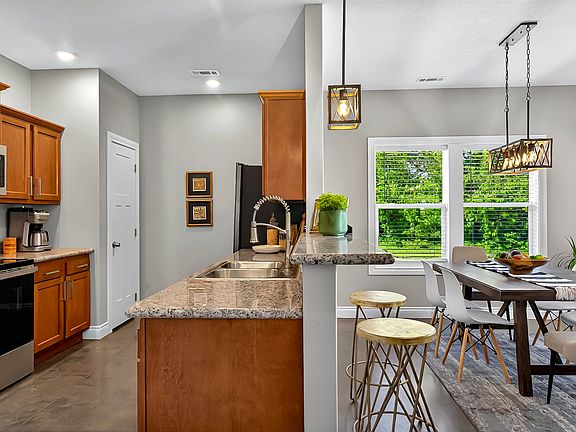 Awesome home in highly sought Rock Fire at the Lake development with community party house, gym, pool, and all the amenities of Lake Shawnee within walking distance! Nice main floor living with zero-entry , laundry, utility closet, and spacious 3-car garage. Beautiful stained concrete floors through-out. Nice open floor plan with the large living room, kitchen, and dining room dividing the space between the bedrooms. Two bedrooms flank a full bath and the huge primary bedroom is ensuite with great shower and walk-in closet. Updates include upgraded trim and quarter round addition, new paint, and upgraded caulking around windows. Great location and neighborhood, nice newer home that fits you perfectly….isn’t that what you were looking for? All kitchen appliances, new washer & dryer remain with the home.