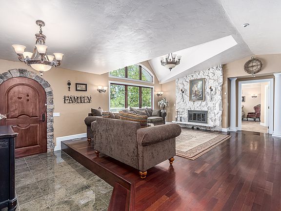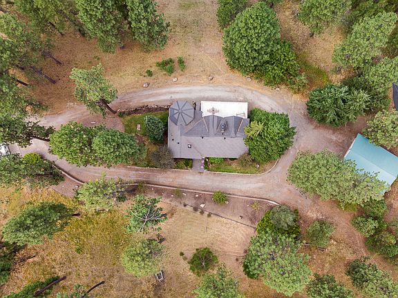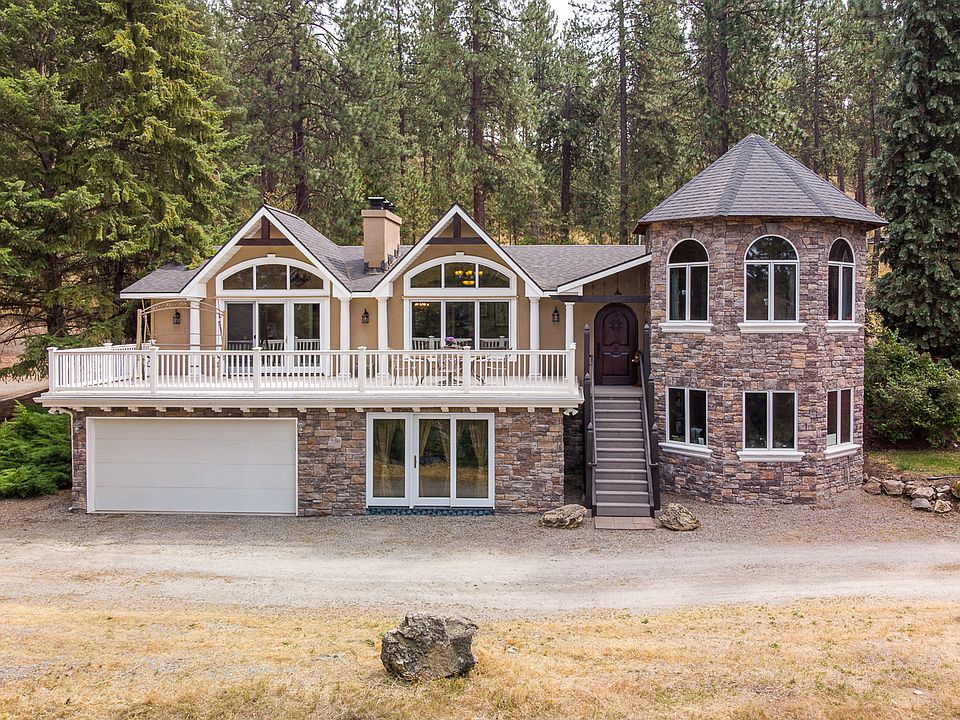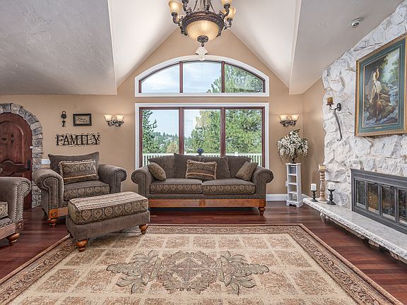 Absolutely gorgeous 4 bedroom (plus spacious office/den), 3 bath custom home situated on nearly 5 acres. This home spares no detail! Spacious kitchen with old world pantry cabinets, stainless appliances and a fabulous wood-burning pizza oven! Gleaming 3/4 inch thick Brazilian Cherry wood flooring, newer carpet, stone accents, upgraded light fixtures. Luxurious master suite with Jacuzzi tub, double sinks, separate shower and a door that leads to the sprawling deck. Guests will love the Turret room with top radius windows and the soaring ceiling. Formal living room with grand fireplace as well as a lower level family room with bar that serves as the perfect popcorn bar as you enter the spectacular theater. The Theater Room includes 10 leather recliner chairs, stadium seating, surround sound, A/V equipment, screen and projector. Mirrored exercise area and wet sauna. Tons of storage! Attached garage with storage room and a detached 1200 square foot shop with new 200 amp panel and 2 RV doors. Too many details to mention! Click on the virtual tour link to view a full 3-d walk-through tour!