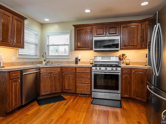 Highly sought-after ranch-style home in the Washburn Rural School District. This well-maintained property features a main floor primary suite with a walk-in closet, walk-in shower, jetted tub, and double vanities + main floor laundry! The floorplan has the primary suite on one side and the other two main floor bedrooms and 2nd full hall bath on the opposite side of the home. The spacious living room offers a cozy fireplace with built-in shelving, and the eat-in kitchen includes a pantry and gas range. The finished basement includes a family room with a wet bar, a full bathroom, a 4th bedroom/bonus room (no closet), and ample unfinished space for storage and mechanicals. Outside, you’ll find a covered deck, fully fenced backyard, and a storage shed set on a concrete pad with an added sidewalk. Recent improvements include a new roof and gutters in 2025, back patio, gas line to the kitchen, and shed relocation with concrete pad around 2020, undercabinet lighting and landscaping updates in 2020–2021, whole house humidifier added in 2023, whole house filter in 2024, appliances around 2017, and exterior paint refreshed in 2023. Come see this beautiful home—you won’t want to miss it!