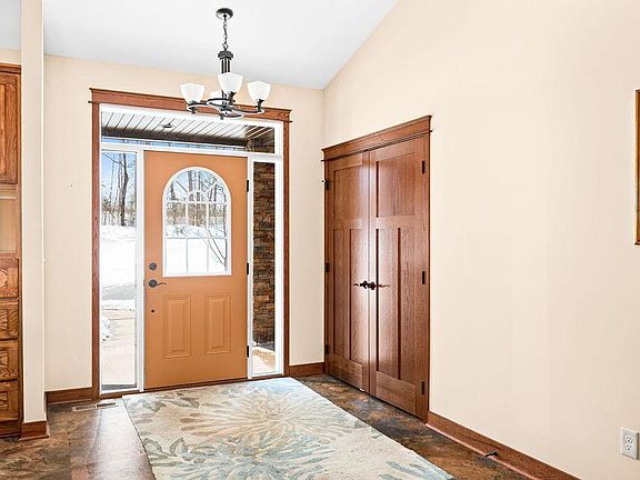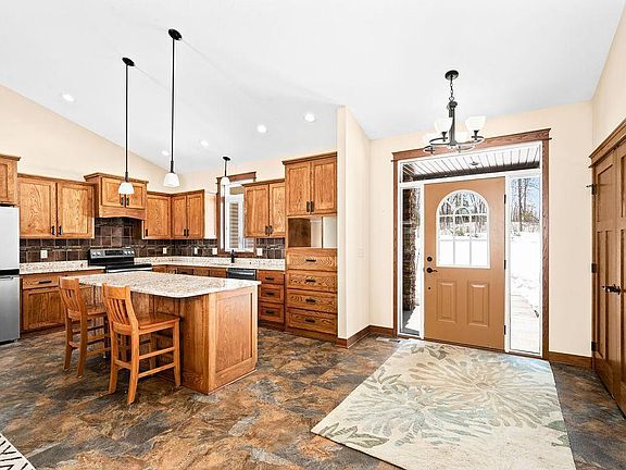 Beautiful 2017 built home. You will notice the quality and attention to detail before you even walk in the front door! This one owner home is spacious and offers over 2100 fin sq ft of one-level living space. Kitchen features beautiful cabinetry and granite countertops. Kitchen island with seating and informal dining area. Primary bdrm with large walk-in-closet & private bath w/tile shower and separate bath. Second bdrm also has a large walk-in closet. Main bathroom is 8x10 with tile shower and plenty of storage space. Third bdrm is on the opposite side of the house. Plenty of windows and four-season porch let in ample sunshine - enjoy from all living areas! A dual-sided fireplace is between the living room and sunroom and patio doors lead out to nice deck overlooking the back yard. Attached, oversized garage (33x29!) is heated with in-floor heat. Outside you'll find 1 acre lot with beautiful landscaping and flower gardens, lawn also has in-ground sprinkler system. Driveway is paved.