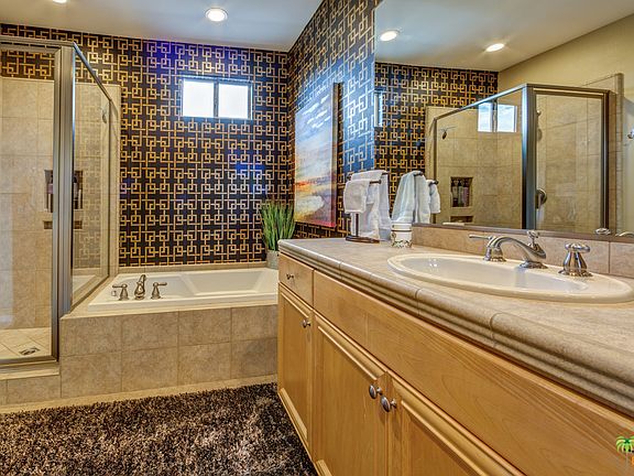 VIEWS, VIEWS, VIEWS !! In walking distance to all the Restaurants, shopping and all the exitement downtown Palm Springs has to offer, this marvelous condominium has it all. Overlooking a beautiful greenbelt, pool area with awesome south western mountain views from downstairs and the upstairs balcony, offering 2 Spacious Master suites upstairs, each with a dedicated luxurious bathroom. Fully Updated home. The Kitchen features granite counter-tops and stainless steal appliances as well as a beautiful Fireplace in the living room. Custom finished walls and window coverings. 2 car attached garage is finished with custom epoxy flooring. This home also has a build in vacuum cleaner. The desirable Community of Village Traditions features a spacious pool/ spa plus a fitness room located right across from the unit. This makes a perfect weekend getaway!