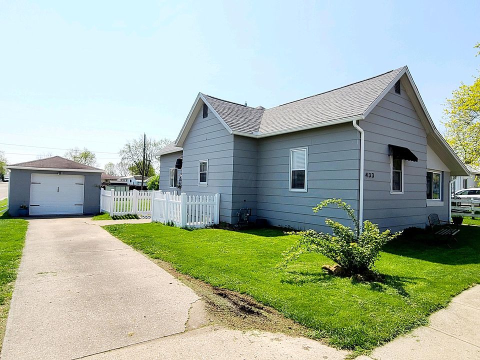 Welcome to 433 E Elm! This adorable 2 bed 1 bath quaint home has had MANY updates in the past 5 years. From large $ items such as roof, some windows, electric panel, flooring, hot water heater, appliances, garage door and opener, insulation, furnace with air purifier , central air, and vinyl fenced back yard to smaller $ cosmetics such as paint, light fixtures, and kitchen/bath faucets. Inside offers HUGE fully equipped kitchen, large living room, 2 adequately sized bedrooms, a perfectly sized home office, and a bath/laundry combo. Outside offers a large fenced in yard, storage shed, and 1 car detached garage. Partial basement for your storage needs.