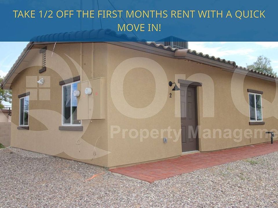 Take 1/2 Off The First Months Rent With A Quick Move In. Charming 2-bedroom, 1-bathroom duplex featuring 803 Sq Ft of thoughtfully designed living space. The stunning interior boasts modern finishes throughout, paired with a highly desirable single-story floor plan for effortless living. Step into a delightful kitchen equipped with sleek appliances, seamlessly flowing into the open-concept living and dining areas-perfect for both relaxation and entertaining. Each of the two generously sized bedrooms offers ample closet space, while the full bathroom impresses with a stylish vanity and contemporary lighting and fixtures. Additional highlights include ceiling fans, an included washer and dryer and low-maintenance landscaping for added convenience. Enjoy ample parking and a prime Tucson location with easy access to I-10. Application: $55 Application Fee Per Applicant 18 years or older (Nonrefundable). Please allow 24 to 72 business hours to process the Application once all required documents are submitted by all applicants 18 years or older. Lease Length: 12-month Minimum (Longer Lease Term may be negotiable) Initial MOVE-IN Costs: Upon application approval, a nonrefundable Holding Retainer will be required to secure the property and will be applied towards the move-in costs. The Holding Retainer amount is determined by the type of Security Deposit option you choose. Applicants can choose between a traditional Security Deposit which may be 1 times the monthly rent but not greater than 1.5 times the monthly rent (75% refundable) or a Security Deposit Alternative program (only available on long-term leases of 12 months or more). A $250 one-time lease preparation fee as well as the first month's rent is due prior to move-in. Pet Policy: Dogs and Cats Allowed with the following exceptions: Small pets will be considered based on approval (11-25 lbs) If the Applicant has a Pet, $150 Non-Refundable Pet Fee per pet. Recurring Monthly Costs: There is a 2.9% Administration Fee. All on Q Property Management Residents are enrolled in the Resident Benefits Package for $39 or $49 with pets, which includes liability insurance, credit building to help boost the resident's credit score with timely rent payments, move-in concierge service making utility connection and home service setup a breeze during your move-in, Renter to Buyer program and much more. All information including advertised rent and other charges are deemed reliable but not guaranteed and is subject to change. Pet Friendly, Concierge, Dishwasher, Washer, Dryer, Microwave, Refrigerator & Ceiling Fan.