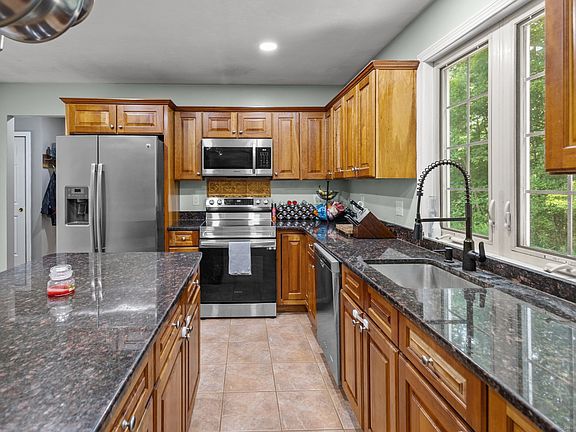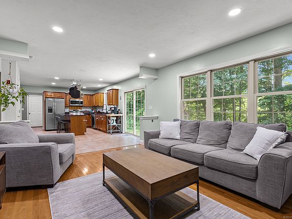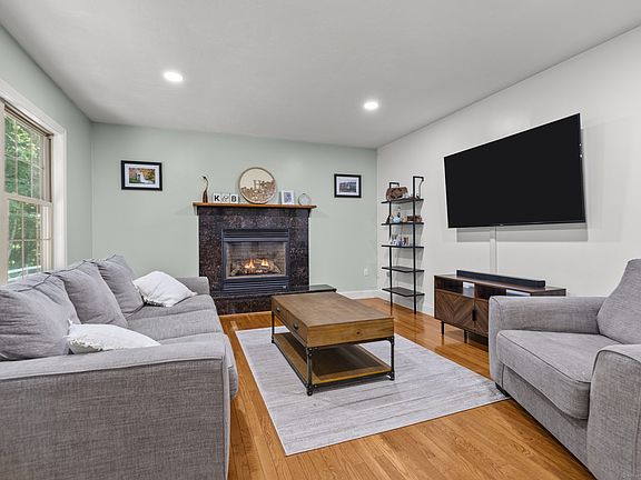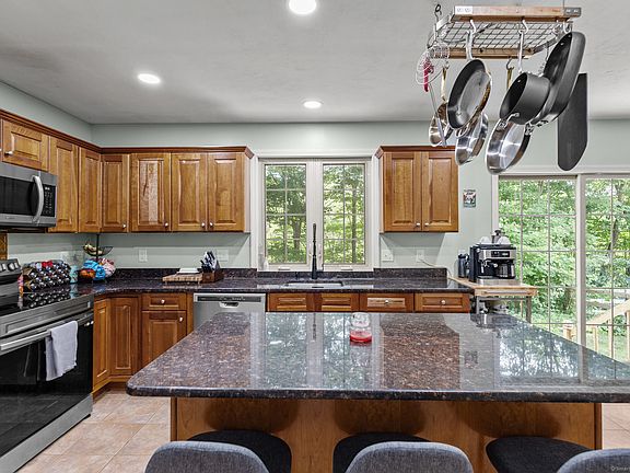 Stunning Thompson Colonial with Exceptional Features! Welcome to this beautiful Thompson home built in 2004, offering 4 spacious bedrooms, 2.5 baths, and a 2-car garage. The open-concept floor plan seamlessly connects the oversized kitchen-complete with granite countertops, stainless steel appliances, a large center island, and hardwood cabinetry-to the inviting living room featuring a granite propane fireplace framed by elegant columns. Step through the front door adorned with decorative leaded glass panels into a grand cathedral foyer with a skylight that fills the space with natural light. The home boasts factory-finished oak hardwood floors throughout the living room, dining room, office/first-floor bedroom, and foyer, along with ceramic tile in the kitchen and baths. A large slider leads out to the backyard-perfect for easy access to the back yard. Recessed lighting enhances the kitchen and living areas, while oversized French doors open to a first-floor office/library complete with bookshelves and space for a piano. A convenient first-floor laundry adds to the home's practicality. Upstairs, you'll find an expansive master suite featuring its own private sitting room, luxurious en-suite bath with a jetted tub, dual vanities with Corian countertops, and two additional bedrooms plus another full bath. Additional highlights include a 2-car garage with side windows and a rear door, a powerful 8kW propane generator (installed in 2012)