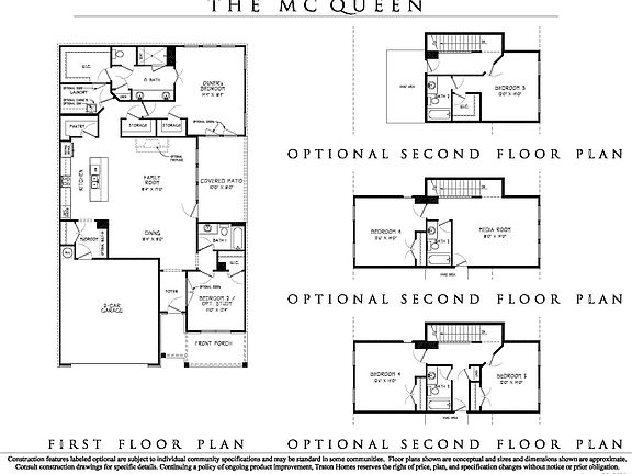 The McQueen plan offers exterior charm with its warm and welcoming covered front porch. The foyer, flanked by a secondary bedroom and full bath, leads to the spacious open living area that includes a stunning kitchen with island and walk-in pantry, a bright family room with views to the covered courtyard patio, and a dining area. The huge owner's suite wing includes two storage closets, optional doors to the courtyard, an elegantly-appointed bath with a large walk-in closet and separate linen closet. Other features include a mudroom and a convenient laundry room located near the owner's suite. For those desiring even more space, an optional second level includes up to 2 additional bedrooms and a full bath, or a media room/bath/bedroom combination.