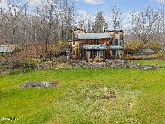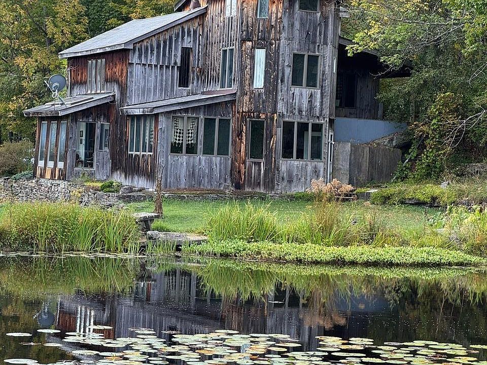 The property features four separate buildings, each with its own character. The main home offers large windows framing tranquil views of the pond, lawns, and surrounding trees. Inside, an open floor plan, spiral staircase, and cozy woodstove create a warm and inviting space, while a new furnace adds modern comfort. The second house, built in the early 1800s and currently used as a workshop or artist studio, showcases original hand-hewn beams and timeless craftsmanship. The passive solar greenhouse is a separate structure with a built-in Koi pond, staying warm enough for tropical plants to thrive year-round. The large storage pole barn provides abundant space for equipment, cattle, or horses.