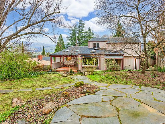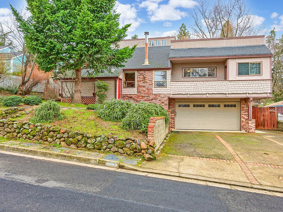Special home w/great location to downtown Ashland w/mountain views & level private back yard w/covered deck and electrical power for hot tub (no hot tub included in sale). Versitale floor plan featuring large master suite w/3 closets, private balcony, spa like bath boasting double sinks,granite counter tops, over sized shower, jetted soaking tub, toilet enclosed & storage cabinet. Gas range, refrigerator, DW & lots of counter space plus pantry & under cabinet lighting. There is a pass through to the formal dining or this space could be used as family room. Off the kitchen there is an area for family space which leads to the private back yard. Off the entry is a wonderful room for an office. 2nd level has 2 bedrooms & 1 bath. Laundry on main level. There is also a space with private entrance off garage for exercise, hobby, office or needs of the buyer. Engineered hardwood floors were just installed in entry, dining, kitchen & hall to primary. Wood buring stove, skylights & views.