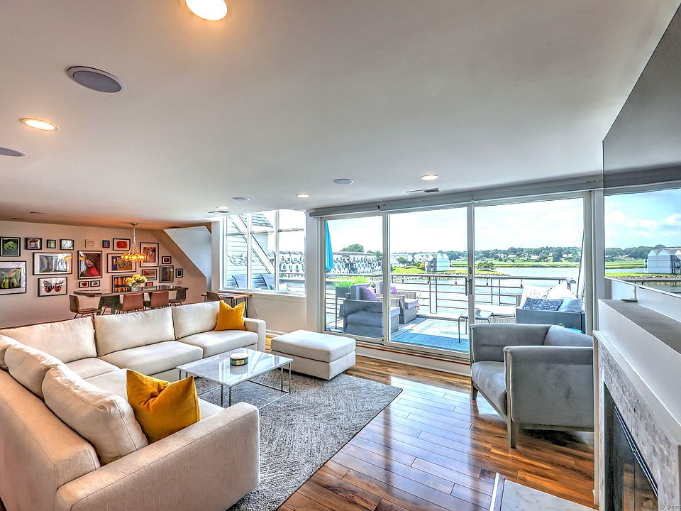 SERENE DIRECT WATERFRONT two-story Townhome with spectacular sunsets & pristine views, 2 bedrooms, both with water views, 2.5 baths, primary suite with 12' ceiling, full bath & walk-in closet with built-ins, open main level floor plan, kitchen with granite counters, large pantry cabinet & two ovens, dining room with modern chandelier and water views, living room with gas fireplace, wall of windows facing water, sliders to a huge deck with front & center view of lovely cove & marina, with plenty of interesting birds & boats for your entertainment! Motorized awning over deck, built-in audio system, programmable electric shades, tons of storage throughout, including built-in cabinets in the upstairs landing, hall storage closet, coat closet with extra side shelves, lots & lots of upgrades. Complex has community pool on the water, new pickleball court & exercise room. DON'T MISS THIS RARE FIND! One or more of the owners is a real estate professional.