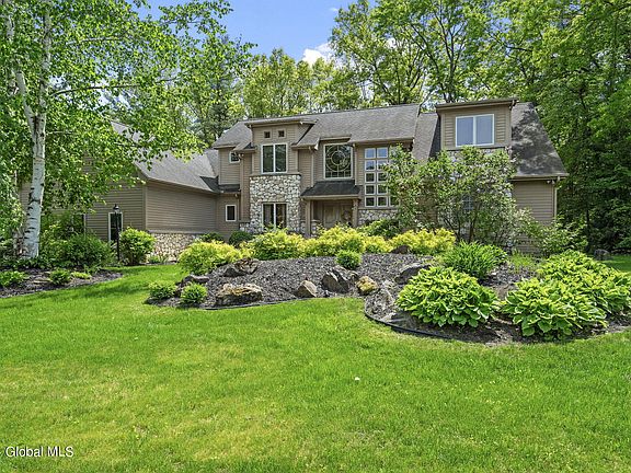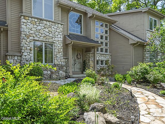 Desirable Haven Hills in Guilderland! Exclusive Charlew Builders contemporary style home situated on 2 acres at the end of the cul-de-sac. With over 4800 sqft combined living space it creates many options for a buyer's needs. Eat in kitchen, formal dining room, living room w/gas fireplace, first floor primary en-suite with spacious dual walk in closets. double vanities and soaking tub. The second floor over looks the living room and has two bedrooms, each with a private bathroom. Finished basement has three points of entry including sliding doors to the rear yard, family room, two additional bedrooms, a full bathroom, and large home office which could easily be a 6th bedroom. Additional storage area could be a vision for a kitchenette. Bring your ideas and create your home oasis!