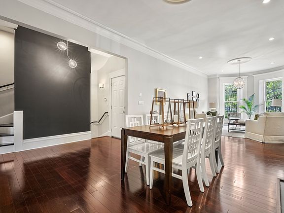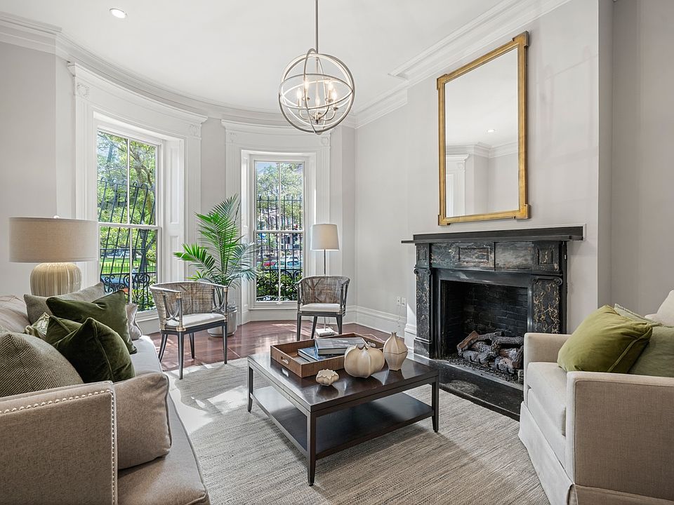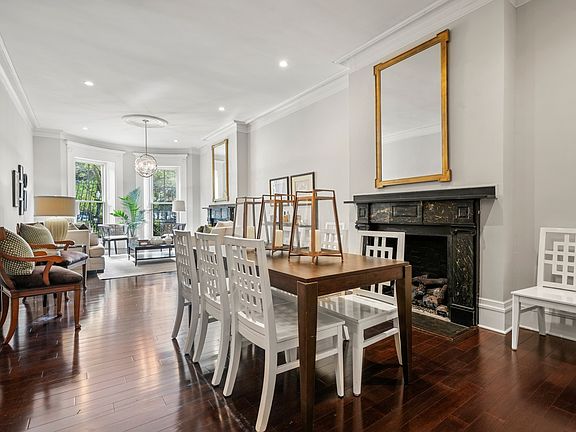 Sun-filled triplex overlooking historic Blackstone Square with 4 large bedrooms, 3.5 baths and a direct access garage parking! The huge living/dining room has high ceilings, floor-to-ceiling windows, 2 gas fireplaces with gorgeous Greek Revival mantelpieces and detail. The kitchen with vented gas cooking opens to a beautiful family room with a walk-out deck and another gas fireplace. A convenient coat closet and half bath round out this amazing living level. Upstairs, the primary suite has a large bath with tub and shower and a walk-in closet with a skylight. The floor also includes another bath and a second bedroom with 3 windows and a gas fireplace overlooking the Square. Downstairs are two more large bedrooms, a full bath and a second kitchen. There is a private rear courtyard, generous storage and utility space, gas-fired heat & HW systems, central AC, and a huge garage with lots of storage for bikes and sports equipment! Roof decks rights for garage roof are included.