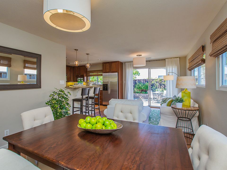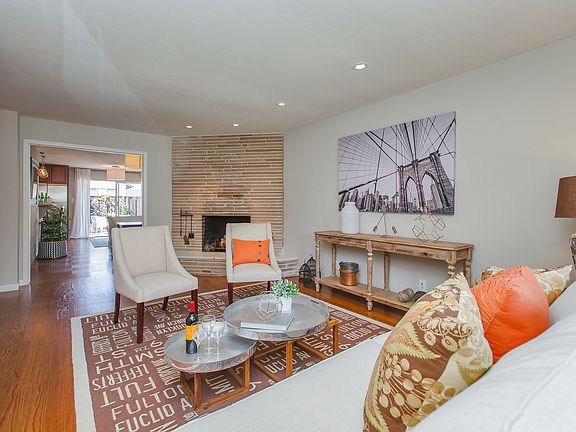 Built in 1962, this attractive Mid-century home has been thoughtfully updated while retaining its character and charm. This spacious home offers a formal living room, kitchen/family combo, four bedrooms, three bathrooms, an office, laundry room, 2 bonus rooms, and a 2-car attached garage. Located in a neighborhood of other mid-century homes, this South Shore house is just three blocks from the beach, two blocks from South Shore Shopping Center, and minutes from top performing schools. A new Therma-Tru front door with satin chrome hardware and a sidelight insert perfectly compliments the mid-century style. Once inside, the home’s spacious formal living room is immediately to the right with newly refinished hardwood floors, LED recessed ceiling lights, and three dual-pane windows that overlook the front yard. A striking stone fireplace occupies an entire corner of the room and is perfect for cozy gatherings. Beyond the living room, is the dining room and family room with beautiful vintage parquet floors highlighted with bright sunlight from the large glass sliding doors that open to the backyard. The spacious backyard is fenced for privacy, and includes a large, beautiful fig tree, blooming bougainvillea, rosemary, apple and lemon trees, and mature roses. A patio next to the kitchen and family room is perfect for indoor/outdoor entertaining. The kitchen adjoins the family room and has been tastefully updated with cherry-stained drawers and cabinets, a divided stainless steel, sink, a Bosch dishwasher, recessed LED ceiling lights, granite counters, and a granite kitchen bar that is perfect for casual meals. Kitchen-Aid stainless steel appliances include a side-by-side refrigerator, built-in microwave, and a five-burner gas range. Tumbled marble subway tiles form the handsome backsplash. From the kitchen, a stairway on the left goes up to the second level, where the master bedroom, master bathroom, and bonus rooms reside. Filled with natural light, the master bedroom has a vaulted ceiling with a pendant light fixture and newly refinished hardwood floors. A walk in closet as well as a pair of additional closets finish the room. The master bathroom is next to the bedroom and has been enhanced with a shower/jetted tub with a marble surround and a contemporary pedestal sink. The beautiful floor consists of large marble tiles with a tumbled marble mosaic border and a center mosaic medallion. Two bonus rooms are located across from the master bath. This versatile space can be used for an office, exercise room, playroom, teen space, or storage—so many options! On the main level, three more comfortable bedrooms run along the hallway; all of them are comparable in size and features, with large, dual-pane windows for natural light, roomy closets, and recently refinished hardwood floors. Two of the bedroom closets have cedar floors, and one of the bedrooms overlooks the backyard garden. An office/study is situated to the left of the entrance, and features recessed ceiling lights, and an interior transom window with opaque glass, which provides natural light from the kitchen. Across the hall is the laundry room with front-loading appliances. Two bathrooms are conveniently located on the hallway off of the bedrooms. One bathroom, close to the kitchen, features a tub/shower combination, a pedestal sink, new light fixture, and an understated ceramic tile surround and floor. A sliding window over the tub opens for ventilation. A second bathroom has a dark wood vanity and a walk-in shower with a mosaic stone tile floor and elegant marble surround. The spacious two car garage completes this home, offering loads of storage space.